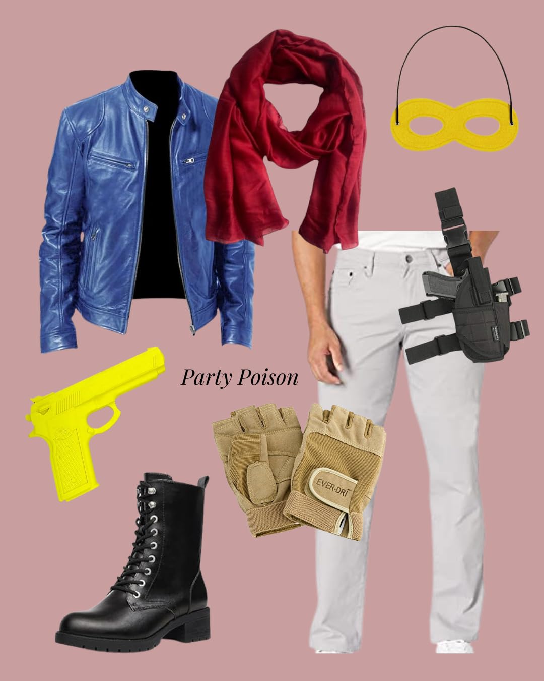 Slip into the neon-drenched Californian apocalypse as Party Poison with blue leather jacket, red scarf, yellow ray gun, and boots made for outrunning Better Living Industries AKA BL/ind, all while looking like a comic book hero who crash-landed at Hot Topic.