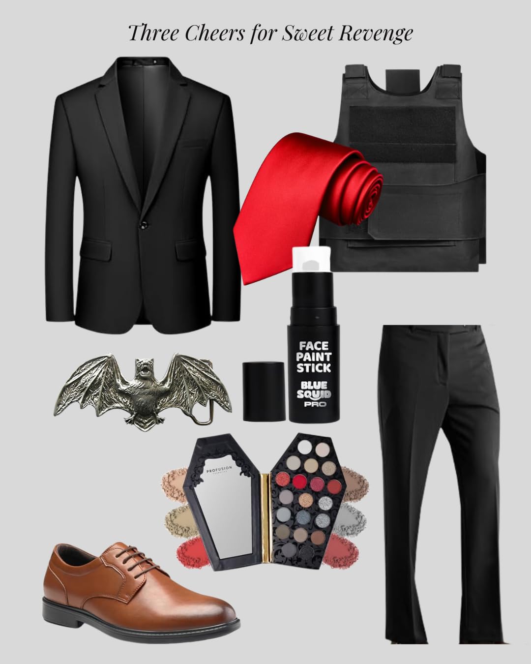 Dress like you were in the middle of a gunfight, in the center of a restaurant... and straight onto the Three Cheers for Sweet Revenge stage - bulletproof vest over a sharp black suit, blood-red tie, and smudged eyeliner. Maybe your neck says something iconic also like CATHOLIC or VERY MUCH ALIVE.