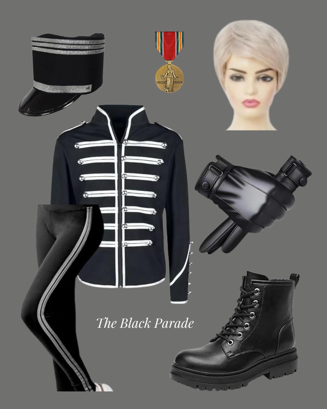 March straight into your own funeral with The Black Parade look - featuring a decorated war veteran military jacket, drum major hat, maybe some Doc Martens combat boots. Pair with despair and you might wake up and notice you're someone you're not.